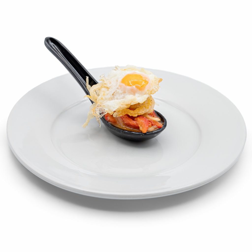 🥣 Ensalada de pimientos asados en leña con chanquetes fritos, coronada con una emulsión de yema de huevo y huevo de codorniz.