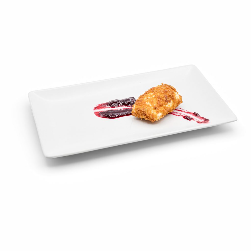🥣 Queso brie crujiente con salsa de frutos rojos.