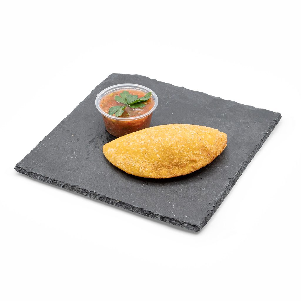 🥣 Empanada rellena de carne de ternera y patata frita, acompañada de picadillo de verdura picante.